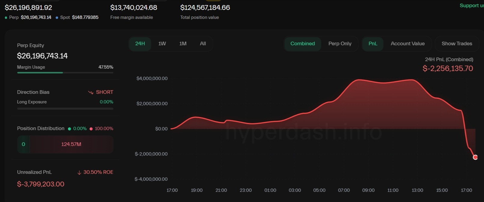 Malgré la remontée du BTC de 108 000 $ à 113 381 $, le Wallet OG a agressé le marché en augmentant sa position SHORT à 124,57M$ USD, adoptant une stratégie d’accumulation baissière (bearish accumulation). Cette manœuvre vise à optimiser son point d’entrée SHORT près de la zone de résistance cruciale (114 000 $ – 117 000 $) et à se positionner pour une liquidation majeure des traders LONG.
