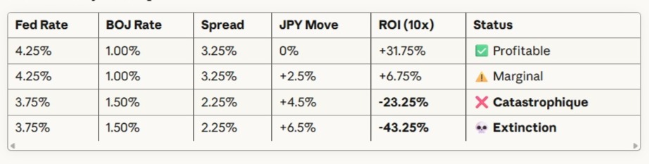En novembre 2025, avec des taux à 4,25% (Fed) et 1,00% (BOJ), l’écart est de 3,25%. Le scénario de double choc réduit cet écart à 2,25%, soit une compression de 1,00%. Ce choc provoque un mouvement de change significatif. La divergence de politique de 1,00% est empiriquement liée à une appréciation du JPY de 2,5%, amplifiée par le momentum à 4,5%. Avec un effet de levier de 10 et des coûts de financement, le Rendement sur Investissement (ROI) du carry trade est calculé à -23,25%, jugé catastrophique et conduisant à un unwind forcé.