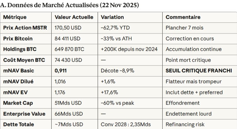 Au 22 novembre 2025, MSTR est en situation critique : le titre chute à 170,50 USD (–62,7% depuis le début de l’année), le Bitcoin est à 84 411 USD. Le mNAV de base a franchi le seuil critique de 1,0 (à 0,911), signalant une valeur inférieure à sa dette nette. L’entreprise, avec une valeur d’entreprise de 66 milliards USD, supporte une dette lourde d’environ 7 milliards USD et fait face à un risque majeur de refinancement de sa dette convertible de 2028. Le verdict de l’analyste est […], justifié par le mNAV < 1,0, un déficit de trésorerie annuel insoutenable de 780 millions USD (contre seulement 130 millions USD de Free Cash Flow logiciel), et le risque de vente forcée de BTC. Un risque d’exclusion de l’indice MSCI en janvier 2026 pourrait engendrer 9 milliards USD de sorties passives. Il est conseillé aux investisseurs de réduire l’exposition à MSTR et de préférer le Bitcoin spot ou les ETF. La structure du bilan est extrêmement concentrée, 95% des actifs reposant sur 649 870 BTC, exposant MSTR à un risque de choc de marché majeur. La dette totale de 7,05 milliards USD, avec un ratio dette/EBITDA de 39x, est dissimulée par un LTV trompeur de 12,9%. Le remboursement de la dette convertible 2028 nécessiterait la vente d’environ 28 000 BTC. Le déficit opérationnel annuel de 590 millions USD, dû au « burn rate » élevé (780 M USD) par rapport aux revenus du logiciel (130 M USD), mène à l’épuisement des réserves en deux ans sans refinancement, forçant une vente progressive et potentiellement fatale de BTC. L’analyse de valorisation repose sur le mNAV. Le mNAV de base (SG, excluant les actions privilégiées des capitaux propres) est à 1,04, contrairement aux sources externes (0,911). Cette chute spectaculaire du multiple mNAV (de 3,20x à 0,91x) reflète une perte de confiance dans le levier du titre. L’analyse des risques sur douze mois anticipe une Valeur Espérée pondérée de 223 USD, mais avec un faible ratio de Sharpe (0,4) dû à une distribution défavorable. Le seuil de défaut technique est fixé à 43 384 USD pour le BTC, déclenchant une vente forcée. La principale menace est la « spirale de dilution » : une chute du BTC entraîne une chute supérieure de MSTR, nécessitant des émissions dilutives qui aggravent la situation. L’exclusion potentielle de MSCI en janvier 2026 est un autre catalyseur de chute majeur (estimé à 15-55% de baisse). Une vente forcée des réserves de MSTR pourrait impacter négativement le prix du BTC de près de 18%. Concernant les actions privilégiées, STRK offre un rendement garanti de 8% mais souffre d’une faible liquidité. STRF offre 10% de rendement, signalant un risque perçu plus élevé.