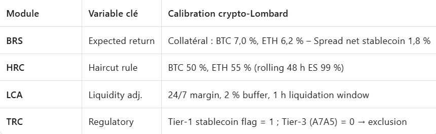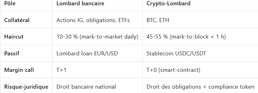 Le Digital Lombard Loan s’apparente au crédit lombard bancaire traditionnel (prêt contre titres), validant l’idée que les riches empruntent sur leurs actifs sans les vendre. Pour les investisseurs institutionnels, l’efficacité de ce levier nécessite une gestion dynamique stricte du ratio LTV et l’exclusion d’actifs considérés comme « toxiques » (ex. stablecoins A7/A7A5). La création de valeur résulte de l’arbitrage entre le coût du capital stable et le rendement des actifs réinvestis, sous condition de neutralisation des risques de « Legal Tail » et de défaillance de contrepartie.