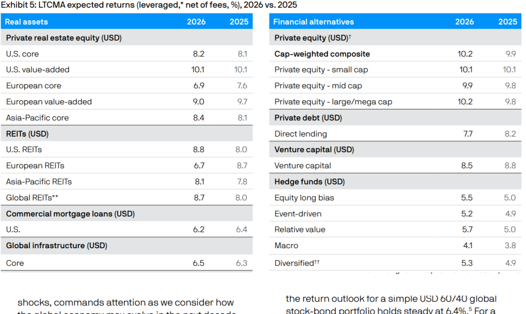 L’analyse comparative des hypothèses clés pour les périodes LTCMA 2025 et LTCMA 2026 met en lumière plusieurs tendances significatives au sein des marchés financiers.