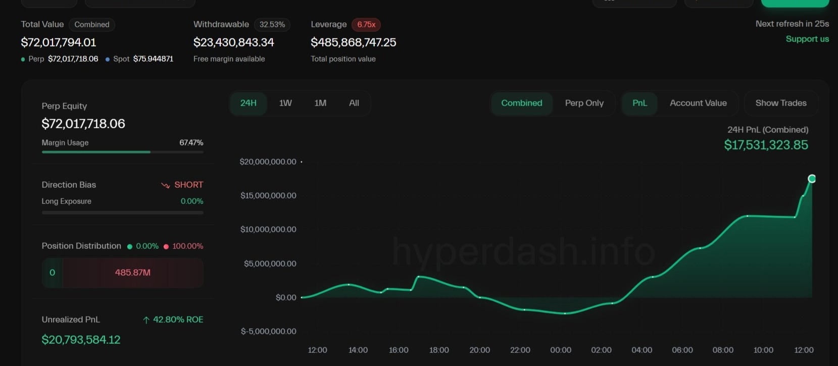 ¤ 14 Oct (maintenant) I $485M (Position Value) I+$20.8M (PnL) I 6.75x (Leverage) I $72M$ (Capital) I +132% explosiont (Evolution)