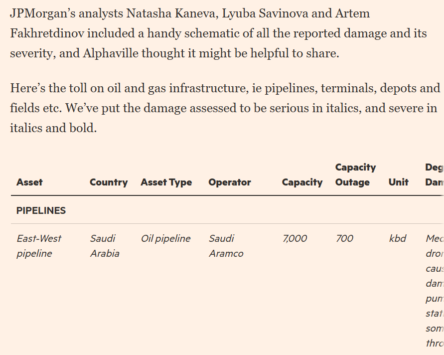 The loss of 700 kbd throughput on the East-West pipeline, which bypasses roughly 5 mbd of flows, is particularly concerning following a recent ceasefire announcement. JPMorgan provided a schematic detailing the reported damage severity across pipelines, terminals, depots, and fields.