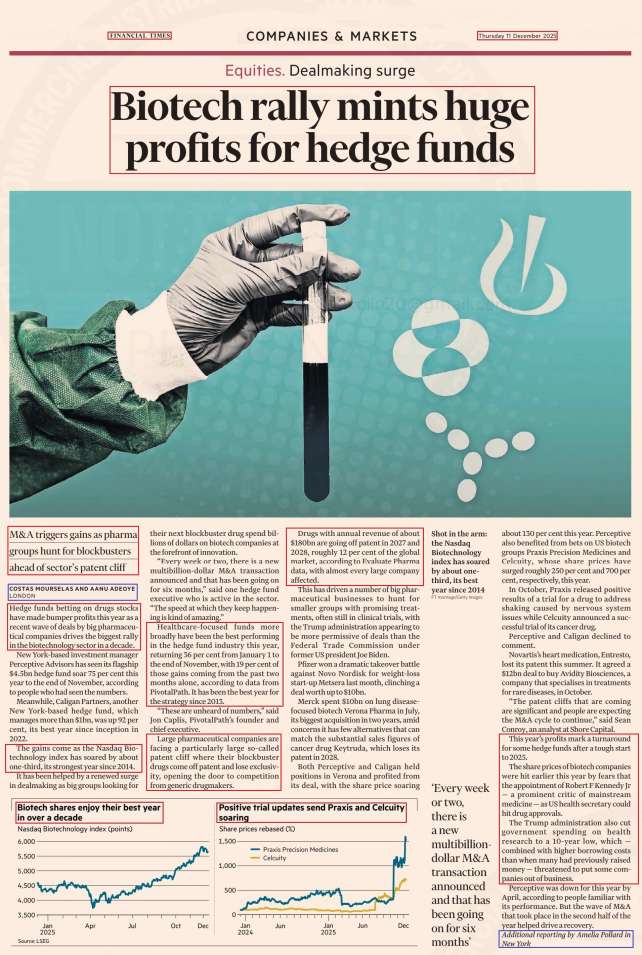 L'article du Financial Times détaille le rallye biotechnologique de 2025, où des fonds spéculatifs spécialisés comme Perceptive Advisors (en hausse de 75 %) et Caligan Partners (en hausse de 92 %) ont profité énormément de l'activité de fusions et acquisitions en plein essor, motivée par l'urgence de la falaise des brevets des grandes entreprises pharmaceutiques,…