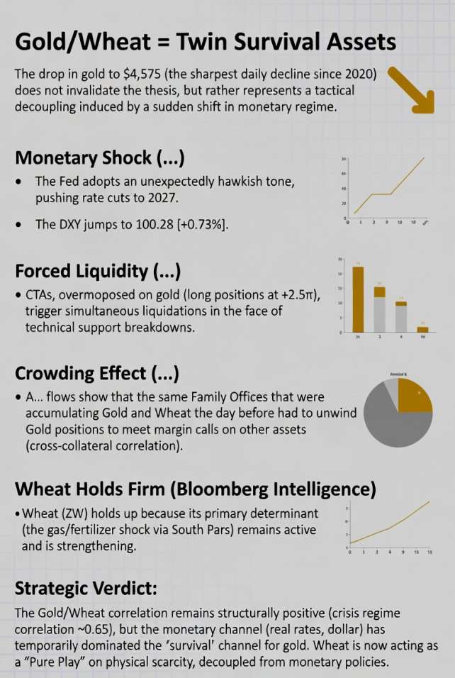 The drop in gold to $4,575 (the sharpest daily decline since 2020) does not invalidate the "Gold/Wheat = Twin Survival Assets" thesis. It represents a tactical decoupling induced by a sudden shift in monetary regime. Multi-engine analysis reveals the following sequence: