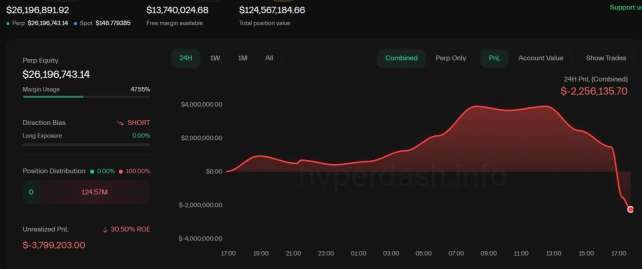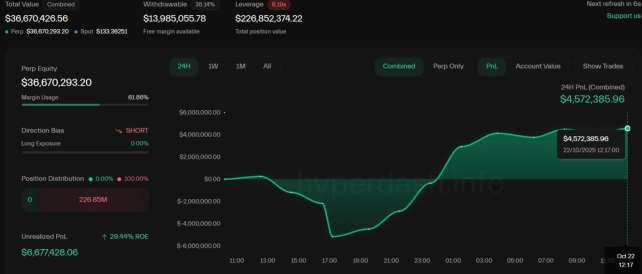 IndicateurValeur (22/10/2025)InterprétationPosition SHORT$226.85 MPosition de taille maximale, légèrement ajustée pour prendre des bénéfices, mais maintenue pour la suite de la baisse.Unrealized PNL+$6.677 MProfit non réalisé de 6.677 M USD. Il a réussi à short efficacement au sommet de la récente remontée.24H PNL (Combined)+$4.572 MProfit total accumulé…