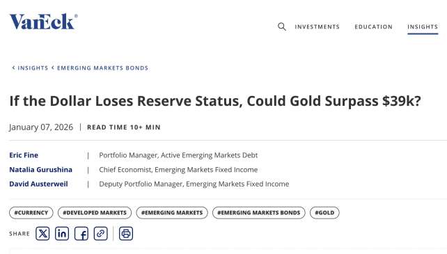 Le rapport VanEck (janvier 2026) analyse la tension sur les bilans financiers. Si le système monétaire basé sur le dollar s'effondre, l'or devient l'actif de réserve neutre sans risque de contrepartie. Cette note décrypte le "Shadow Pricing" et évalue les faiblesses des banques centrales du…