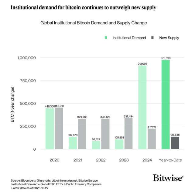 2. Les ETF achètent 975 000 BTC cette année contre seulement 136 000 minés (ratio 7:1), retirant massivement l'offre du marché et signalant un Super-Cycle Haussier.