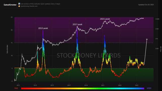 1. La mise à jour du Satoshimètre de Stockmoney Lizards, un indicateur technique/on-chain propriétaire, signale un puissant soutien à la thèse d'un "Blow-Off Top" imminent pour le Bitcoin, réfutant l'idée d'un sommet de cycle prématuré.