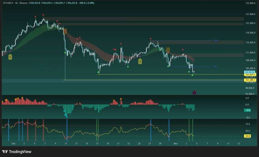 Analyse de marché Cryptos Economie À $103 702, le BTC est en train de traverser une phase critique de liquidation des positions longues. Tous les indicateurs techniques, on-chain et de micro-structure convergent vers un seul scénario : une purge finale vers la zone de Juste Valeur d’Accumulation ($90K–$95K)novembre 4, 20250CommentsByOleg Turceac