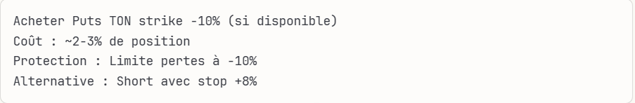 – couvrir avec des puts strike ‑10 % (coût 2‑3 %) ou short stop‑loss +6 %, et