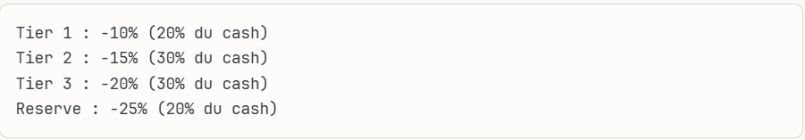 – préparer des achats progressifs entre ‑15 % et ‑25 % après le dump.