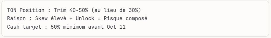 ❷ TON, dont l’unlock est prévu le 11 octobre, subit un double risque : protection accrue via le skew et ventes massives potentielles à l’unlock, rappelant le dump d’APT (‑18 %).