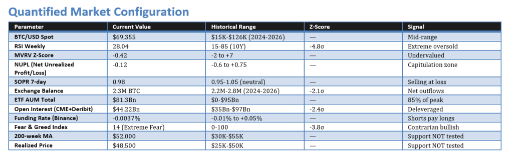 Le Bitcoin montre une configuration technique asymétrique favorable post-rebond de 11.7% (62 400 $ à 69 500 $ en 48h) dans un contexte de capitulation structurelle terminale. Notre analyse indique un ratio risque/rendement de 1:6.2 et une probabilité de scénario haussier de 68% sur 6-10 semaines. La thèse centrale est celle d’une « V-Shaped Accumulation » typique des creux de cycle, renforcée par une convergence de métriques on-chain, techniques et macro-économiques créant un « Supply Shock mathématiquement inévitable« . Les indicateurs clés appuient cette thèse : le RSI hebdomadaire est à 28.04 (survente extrême), les flux ETF enregistrent +257.7 M$ (renversement institutionnel), l’Open Interest a chuté de 53% (dé-levierage complet), les sorties des bourses sont fortes (23 000 BTC/jour d’accumulation silencieuse), le ratio de baleines montre une distribution vers les détaillants (64% d’entrées), et le taux de financement est négatif (-0.0037%), signifiant que les vendeurs à découvert paient les acheteurs.