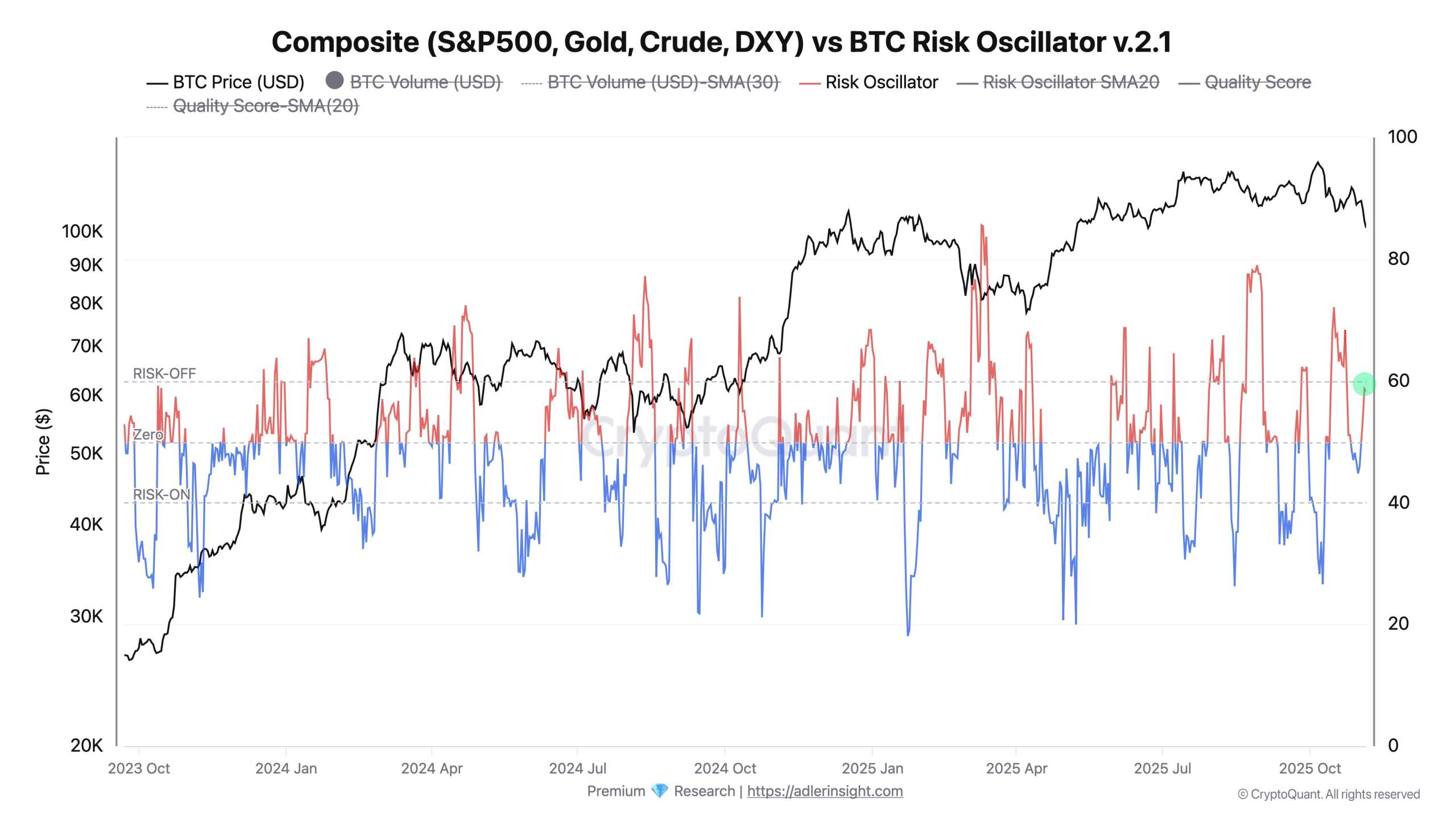 (2.1) L’oscillateur de risque BTC v2.1 à 58 points approche le seuil de 60, signalant une transition vers un régime « Risk-Off ».