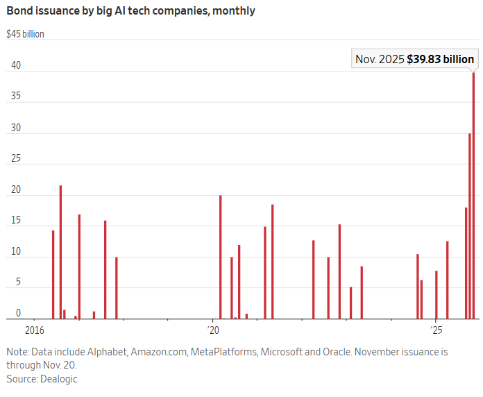 Selon les données de Dealogic (un suivi de premier plan du marché de la dette), Alphabet (Google), Amazon, Meta, Microsoft et Oracle ont collectivement émis 88 milliards de dollars de nouvelles obligations de qualité investissement au cours du trimestre de septembre à novembre 2025.