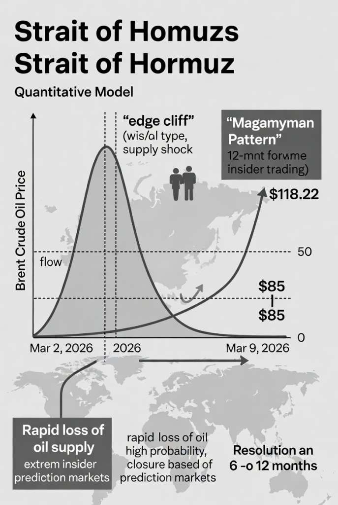 signalant que le rendement de commodité (y) dépasse significativement le coût de portage (r+delta). L’écart de prix sur 12 mois est de -33.22$, indiquant une crise aiguë anticipant une résolution vers 85$ dans 6 à 12 mois, sans capacité de stockage disponible. L’intégration des marchés de prédiction comme oracles utilise un modèle Bayésien combinant données et probabilités de Polymarket. Le 9 mars, la probabilité de fermeture de l’Ormuz en mars était de 84% (impact +40$), et en juin de 87% (impact +35$). Une détection d’information sensible est signalée par le « M… Pattern » : un trader ayant réalisé 553,000$ sur la mort de Khamenei 48h avant l’événement, suggérant la circulation d’informations privées dans des réseaux gouvernementaux, déclenchant une alerte d’investigation automatique via un score d’initié basé sur la volatilité attendue et le timing précis.