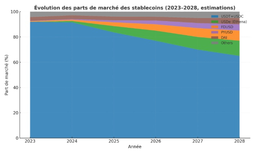 ❷ Un oligopole émergent se construit : les acteurs classiques (USDT, USDC) cohabitent avec USDe (yield 8‑15 % via staking ETH), FDUSD (intégration Binance, moins transparent), PYUSD (400 M d’utilisateurs PayPal, très centralisé) et DAI (décentralisé).