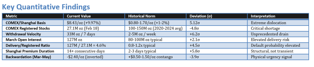 L’analyse microstructurelle de l’argent (XAG) en février 2026 révèle une dislocation sans précédent entre les prix « papier » (Futures COMEX) et les marchés de livraison physique (SGE/SHFE). Nous observons une rupture de la loi du prix unique (Law of One Price), induite par une pénurie de stock de catégorie « Investment Grade » et des frictions logistiques majeures.