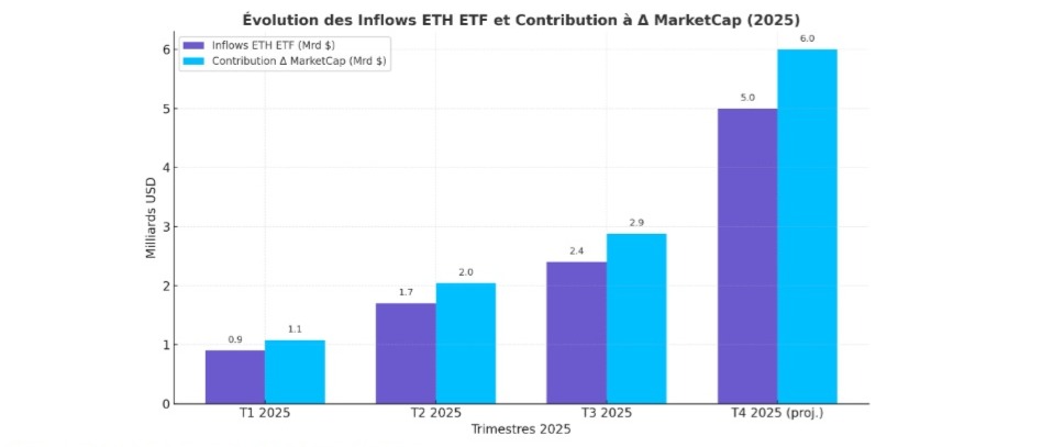 Évolution des Inflows ETH ETF vs contribution à Δ MarketCap (2025)