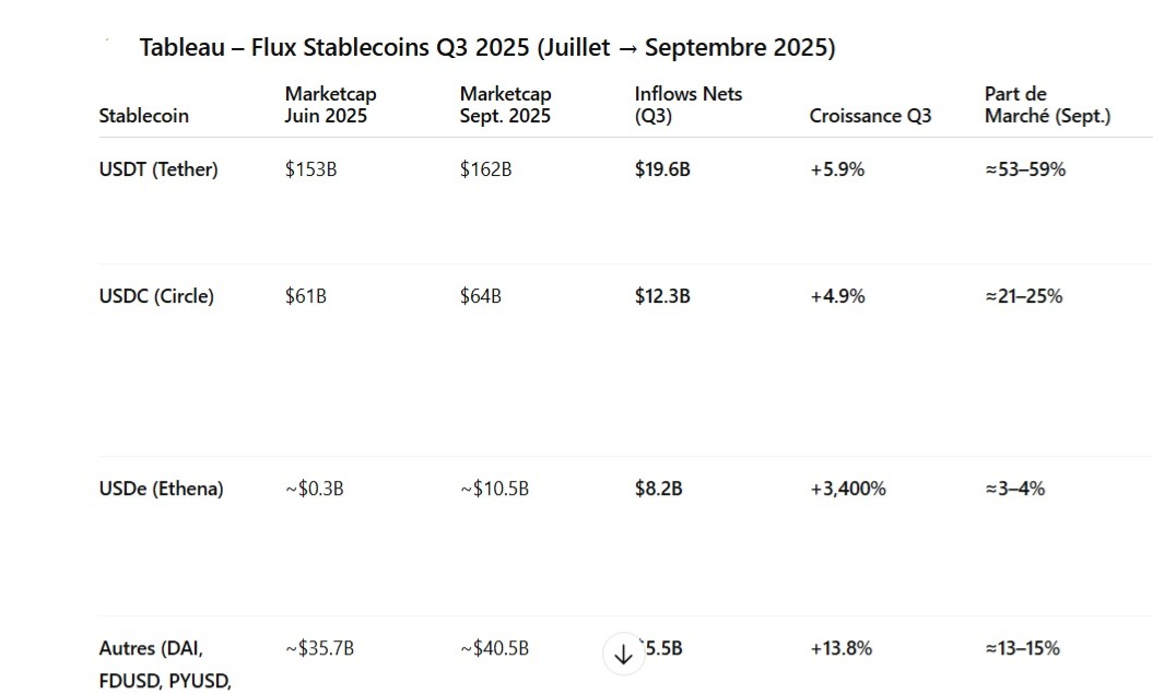 ❷ USDC (Circle) : USDC a enregistré une remontée significative avec $12.3 milliards d’inflows nets en Q3, passant de seulement $500 millions en Q2, avec 25% de part de marché .