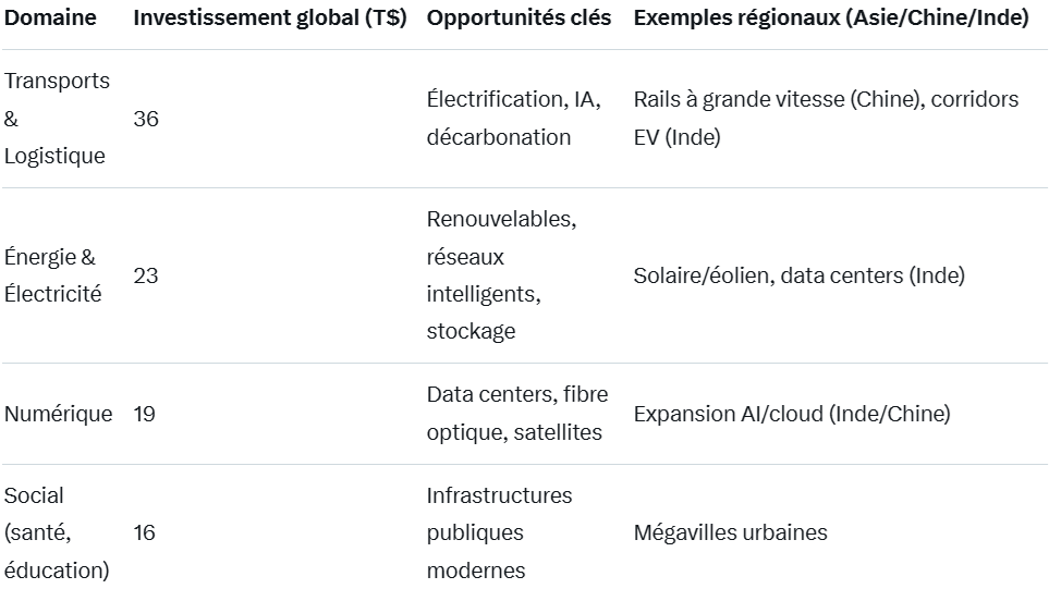 Le secteur Transport & logistique domine les investissements avec 36 T$, se caractérisant par une dualité entre le cycle de remplacement en Occident et l’expansion en Asie. L’augmentation des dépenses n’est pas uniquement due à la croissance du trafic, mais à la transformation structurelle des actifs physiques. L’électrification des mobilités entraîne un basculement des infrastructures pétrolières classiques vers des corridors de recharge électrique et des infrastructures à hydrogène vert. Cette transition exige un renforcement significatif du réseau de distribution moyenne tension, perçu comme des projets de financement structuré (Project Finance) rentables mais soumis à des risques réglementaires importants. Parallèlement, la résilience de la chaîne d’approvisionnement (Supply Chain Resilience), influencée par le phénomène de « friend-shoring », stimule les investissements dans les ports et les hubs logistiques, particulièrement en Asie du Sud-Est et en Méditerranée. Cette fragmentation du commerce mondial déplace la priorité du modèle « Just-in-Time » vers le modèle « Just-in-Case », augmentant le ratio capital/revenu des infrastructures logistiques. Le secteur ferroviaire connaît une concentration majeure des dépenses d’investissement (Capex) en Chine et en Inde. On anticipe une réduction des coûts opérationnels grâce à l’automatisation et à la maintenance prédictive basée sur l’intelligence artificielle, ce qui améliore le ratio de couverture du service de la dette (DSCR) pour les projets ferroviaires concédés. Enfin, la logistique du « dernier kilomètre » fait l’objet d’investissements importants dans les mégapoles asiatiques pour financer des systèmes logistiques urbains automatisés. Ces actifs sont jugés stables et offrent une couverture contre les récessions, car la demande de consommation de base reste peu sensible aux cycles économiques.