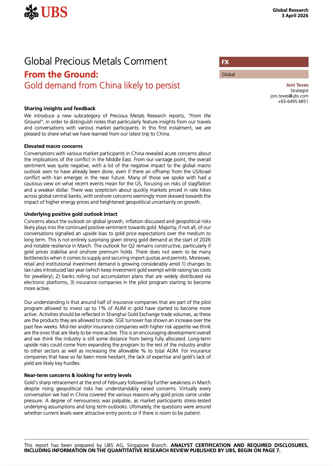 L’or a subi une forte correction fin février 2026, suivie d’une faiblesse en mars. Les risques géopolitiques ont engendré de la nervosité, chaque entretien en Chine ayant abordé la pression exercée sur les prix. Malgré cela, les hypothèses à long terme demeurent valides. UBS cherche des niveaux d’entrée attractifs plutôt que d’appeler à un achat immédiat ; le marché débat si les prix actuels offrent un bon point d’entrée ou si une plus grande patience est nécessaire. **Conclusion d’UBS** La Chine devrait rester un moteur de demande persistant et majeur pour l’or jusqu’à la fin de 2026 et au-delà. Les volatilités de prix à court terme et les titres macro/géopolitiques peuvent créer des baisses, mais l’achat structurel des institutions chinoises (banques + assurances) et les changements de politique favorables maintiennent une perspective positive à long terme. Le rapport adopte un ton constructif sur la trajectoire à moyen et long terme sans donner de cible de prix spécifique. Ce document marque le début de la série « Du terrain » d’UBS, partageant des retours directs des conversations avec les participants au marché.