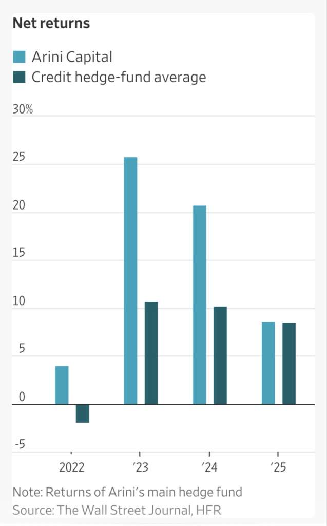 Hamza Lemssouguer‘s Arini Capital fund, launched in 2022 with $1.3 billion and reaching $20 billion in assets under management, is highlighted for its focus on European distressed debt and high-yield credit refinancing for companies like Altice. Arini closed its flagship fund at $4 billion to maintain performance and is expanding into CLOs and private credit. Its highly leveraged strategy has generated high returns (~25% in 2023, ~20% in 2024), outperforming the average for credit funds, but raises concerns about its vulnerability should bets on debt reverse. Approximately 60% of the funds come from North American investors.