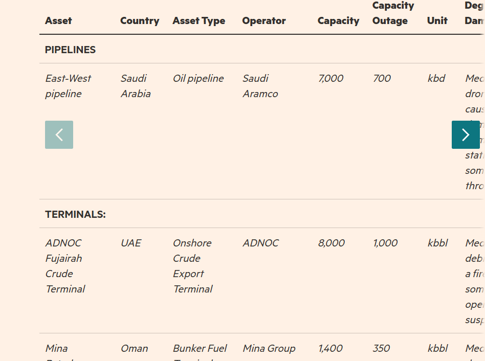 Pipelines.The East-West pipeline in Saudi Arabia, operated by Saudi Aramco, experienced medium damage from a drone attack on a pumping station, resulting in a 700 kbd throughput loss out of a 7,000 kbd capacity.