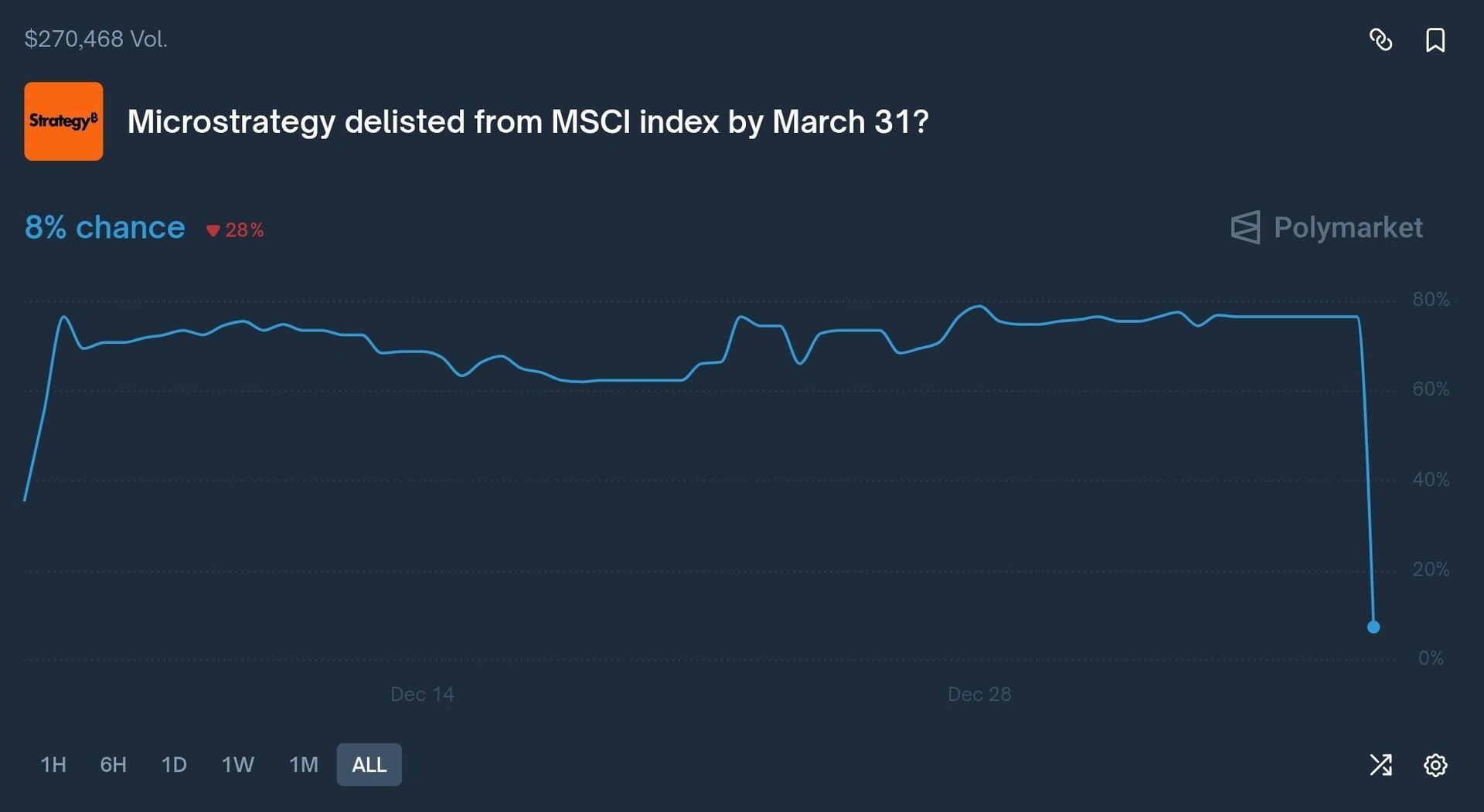 Polymarket prévoyait une exclusion totale à 80%, mais le résultat fut une restriction ciblée sur la croissance du poids. Le marché a mal évalué la volonté de MSCI de conserver une exposition crypto tout en limitant la dilution forcée pour les investisseurs passifs, optant pour un compromis régulatoire et technique.
