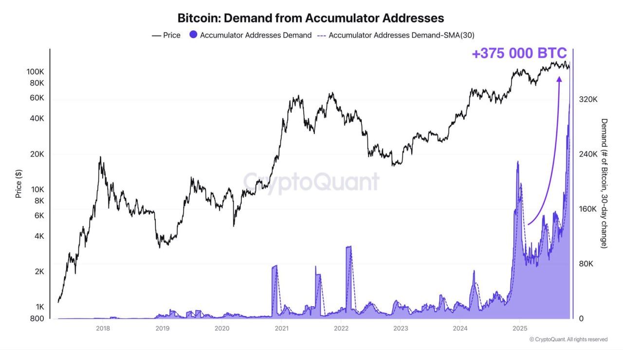 6. Les adresses accumulatrices (whales) ont enregistré une demande record de 375 000 BTC en 30 jours.