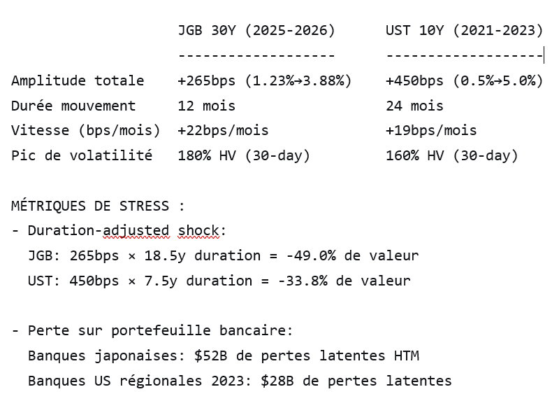 Les rendements des JGB (Japanese Government Bonds) connaissent une accélération vertigineuse : JGB 30Y à 3.875% (+265bps depuis janvier 2025) et JGB 10Y à 2.34% (plus haut depuis 1999). Cette dynamique rappelle structurellement le choc des taux US de 2022-2023 qui a provoqué les faillites de Silicon Valley Bank, Signature Bank et First Republic. Notre analyse révèle que le risque systémique japonais dépasse maintenant le risque américain de 2023 sur plusieurs dimensions critiques. Nous assistons au début d’un unwind du carry trade JPY à l’échelle mondiale, avec des implications potentiellement plus graves que la crise US de 2023. L’exposition totale est estimée à $11.5T, et une appréciation du JPY de 15% pourrait déclencher des pertes systémiques de $2.5-3.5T.