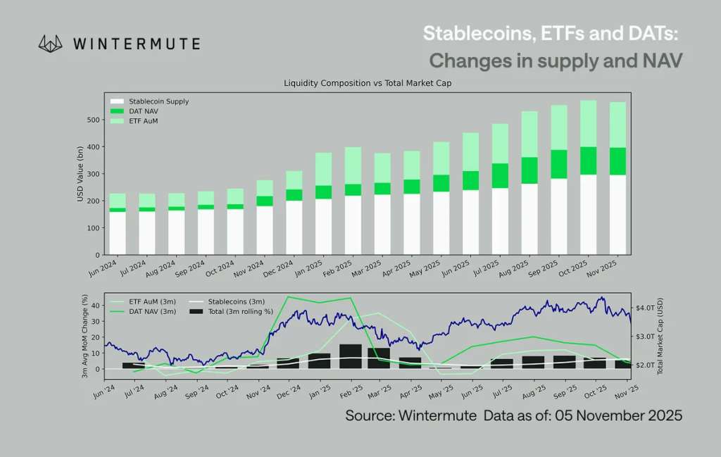 2. Les données Wintermute (ci-joint) montrent un plateau dans l’émission de stablecoins depuis mi-2025, indiquant une stabilité de la demande interne sans nouvel apport de capital frais.