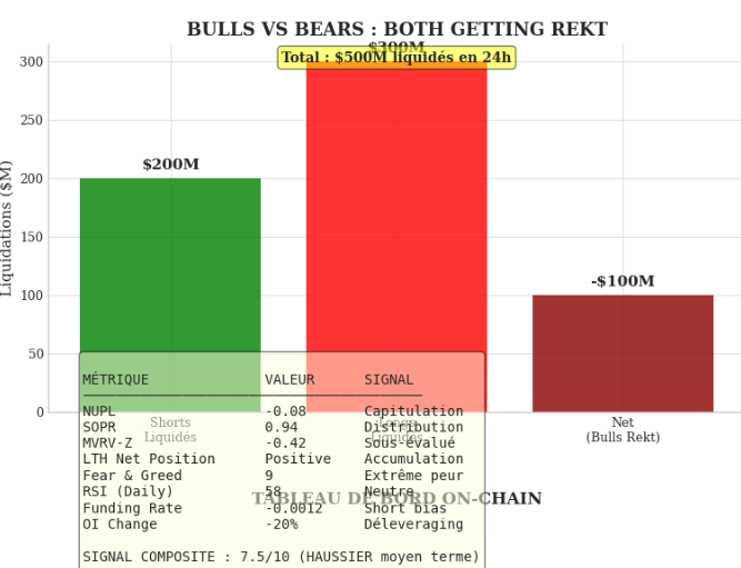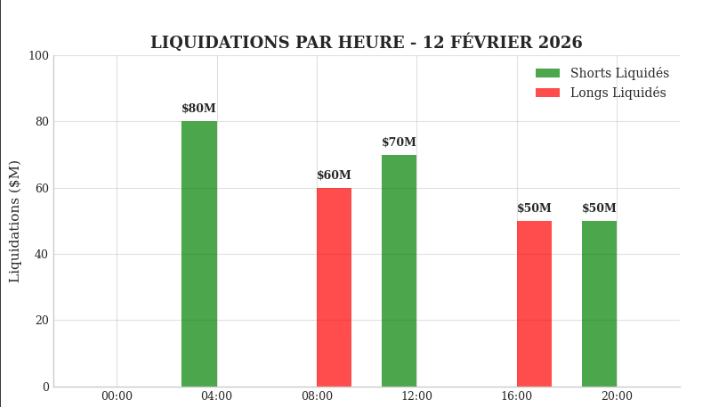 Le marché du Bitcoin, le 12 février 2026, évolue dans une configuration de « volatilité sans direction » (choppy volatility), oscillant violemment dans une fourchette étroite entre $66K et $68K. Le prix est à $66,602.60 (-0.70%), avec un volume de 11.52K BTC. Cette zone de marché, appelée « The Chop Zone » et survenant après une capitulation, est dominée par des algorithmes des MM. L’activité a provoqué des liquidations importantes. $200M de shorts ont été éliminés lors de pompes au-dessus de $68K, et $300M de longs ont été liquidés lors de chutes sous $66K, totalisant $500M de liquidations en 24 heures, affectant aussi bien les haussiers que les baissiers.