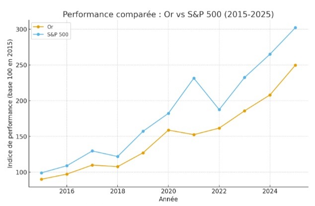 Sur 10 ans, le S&P 500 reste globalement plus performant, mais les pics de volatilité (2020, 2022, 2025) montrent que l’or demeure une assurance contre l’instabilité économique et monétaire.