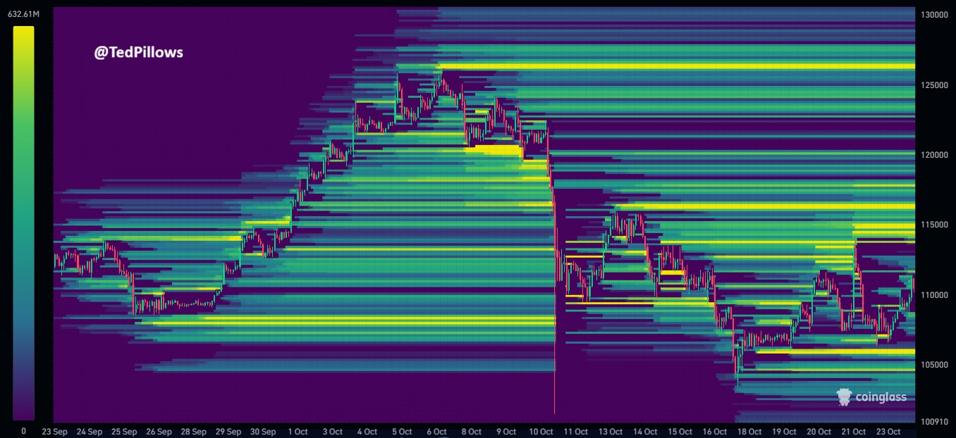 3. La cassure confirme la phase d’exécution. Les premières liquidations se sont produites entre $109 800\$ et $111 235\$ (liquidations des Shorts les plus faibles). Des preuves visuelles (datées du 24 octobre 2025) montrent un achat massif de positions Long qui a injecté la liquidité nécessaire pour dépasser $110 000\$ et forcer les premières couvertures Short. L’objectif est désormais la zone de $112 000\$ à $120 000\$ où se concentrent environ $17$ milliards de liquidité Short (HeatMap).