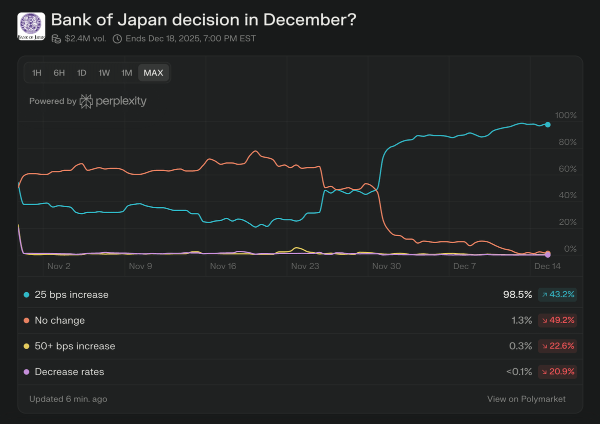 Le graphique de Polymarket indique une probabilité de 98,5% d’une augmentation de 25 points de base à 0,75%, le taux le plus élevé au Japon depuis 1995, qui pourrait être dévoilée le 19 décembre 2025.