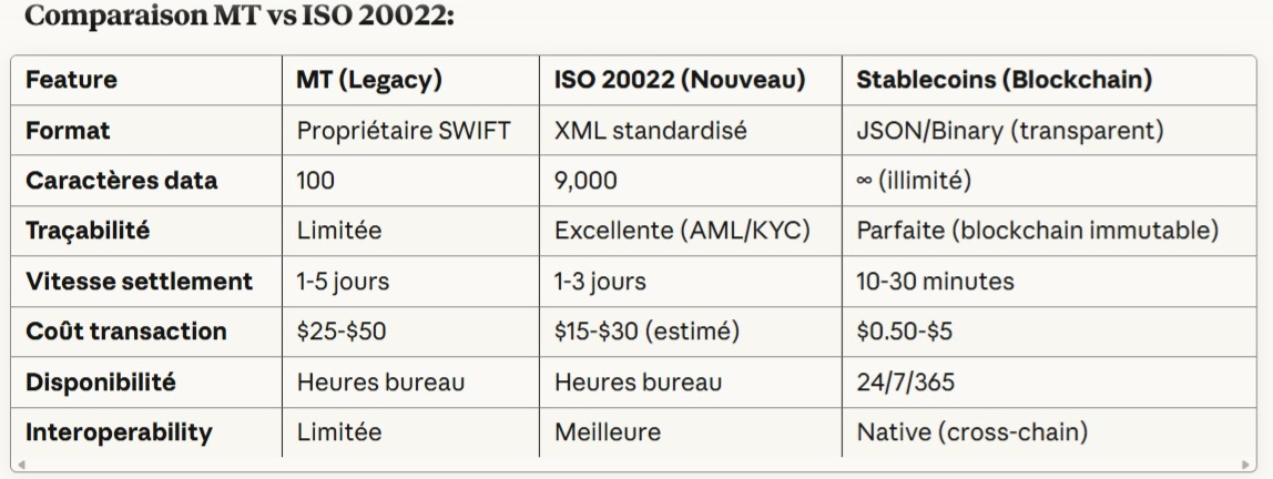 4. Pendant que le système traditionnel force l’adoption d’ISO 20022 (croissance réglementaire forcée), il se heurte à l’efficacité nativement supérieure des stablecoins (USDC/USDT). Les stablecoins sont intrinsèquement alignés sur les exigences ISO 20022 — données structurées, traçabilité AML, rapidité de règlement (10-30 minutes contre J+1 à J+3 pour SWIFT) et architecture 24/7 sans intermédiaires, offrant un coût marginal quasi nul par transaction (contre 15-50 $ pour SWIFT).