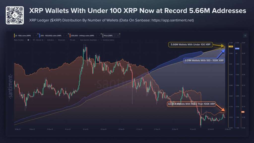 The Mosaic Signal underscores that the explosive growth of Retail wallets (<100 XRP) to 5.66 million (+340% YoY) is the key indicator of mass adoption. This dynamic, combined with the discreet accumulation by large holders into cold wallets, suggests a typical configuration of Wyckoff’s Phase D, preceding a significant market move. Regarding on-chain indicators (as of 03/21/26), the total number of wallets reaches 7.70 million, with accelerated growth, heading towards the adoption alert threshold of 10 million. The most dynamic cohort remains the smallest wallets (0-100 XRP) at 5.66 million, signaling strong retail adoption.