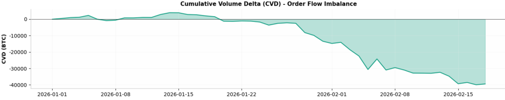 Le marché du Bitcoin est actuellement dans un « Bearish Overhang ». Le déséquilibre de l’Order Flow suggère que le « Bottom » n’est pas encore confirmé par une hausse du CVD.