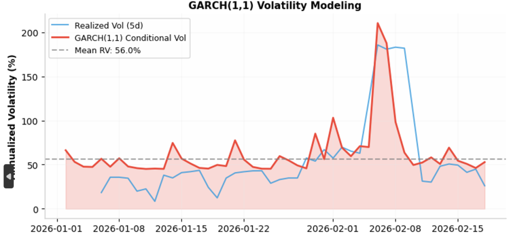 Paramètres. α =0.15, β =0.71. La persistance de la volatilité (α + β = 0.86) indique une lente dissipation des chocs de prix. La volatilité annuelle projetée au 18/02/2026 est de 52.85%.