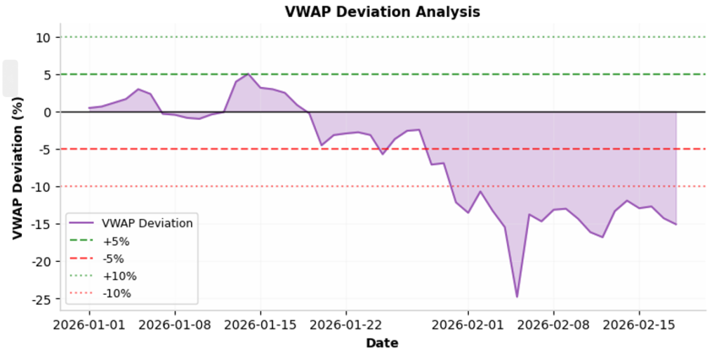 Sur la période étudiée, le Bitcoin a transité d’un régime de Low Volatility Accumulation (~$88,800) vers un scénario de Crisis Deleveraging, touchant un support technique majeur à ~$66,700, soit un drawdown de -24.8%. L’analyse de l’Order Flow révèle une prédominance du Cumulative Volume Delta (CVD) négatif, confirmant que la baisse n’est pas une simple correction technique, mais une capitulation des « Takers » institutionnels.