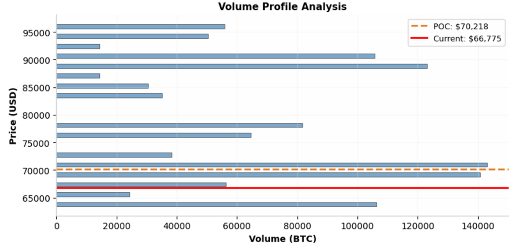 La distribution du volume par niveau de prix montre un POC (Point of Control) à ~$68,500.