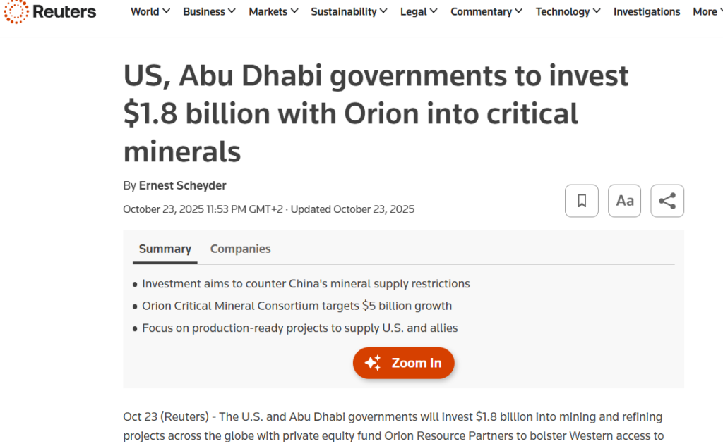 1. Les gouvernements américain et d’Abou Dabi, avec Orion Resource Partners, injectent 1,8 milliard de dollars dans l’Orion Critical Mineral Consortium pour des projets d’extraction et de traitement de minéraux critiques (lithium, terres rares, etc.) dans le monde.