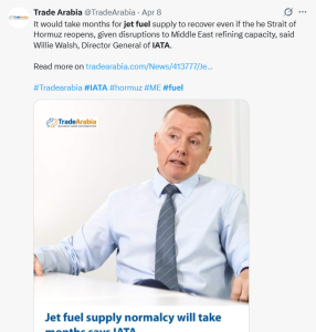 IATA chief says jet fuel supply could take months to recover after Hormuz reopening https://t.co/0KqLSqjPPM pic.twitter.com/H0qhi64avY — Alma Angeles (@AlmaANET25) April 8, 2026