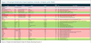 A JP Morgan Commodities Research table listing specific oil and gas assets hit across the Middle East,…