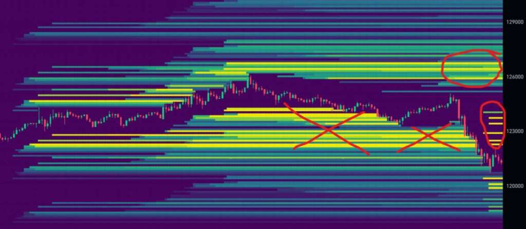 - Fuel Concentré : La Heatmap (Image 41) montre une résistance dense (barres jaunes/vertes) juste au-dessus de $126,000 (cercle rouge supérieur). La carte de liquidation (Image 47) confirme que le Short Fuel est concentré à ce niveau.