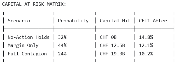 La matrice du capital à risque quantifie les scénarios : le scénario de seule marge (probabilité de 44 %) entraîne une perte de capital de 12,5 milliards CHF et un CET1 de 12,1 %.