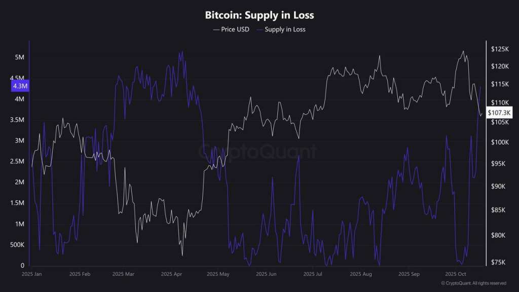 ❶ L’image révèle un signal de creux structurel majeur pour le Bitcoin, marqué par un « Supply in Loss » historique de 4,3 millions de BTC, représentant une hausse de +37,5% du BTC en perte.