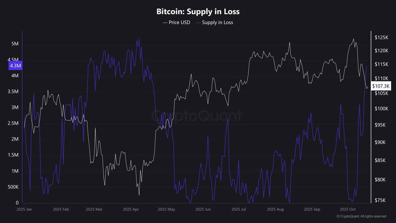 ❶ L’image révèle un signal de creux structurel majeur pour le Bitcoin, marqué par un « Supply in Loss » historique de 4,3 millions de BTC, représentant une hausse de +37,5% du BTC en perte.